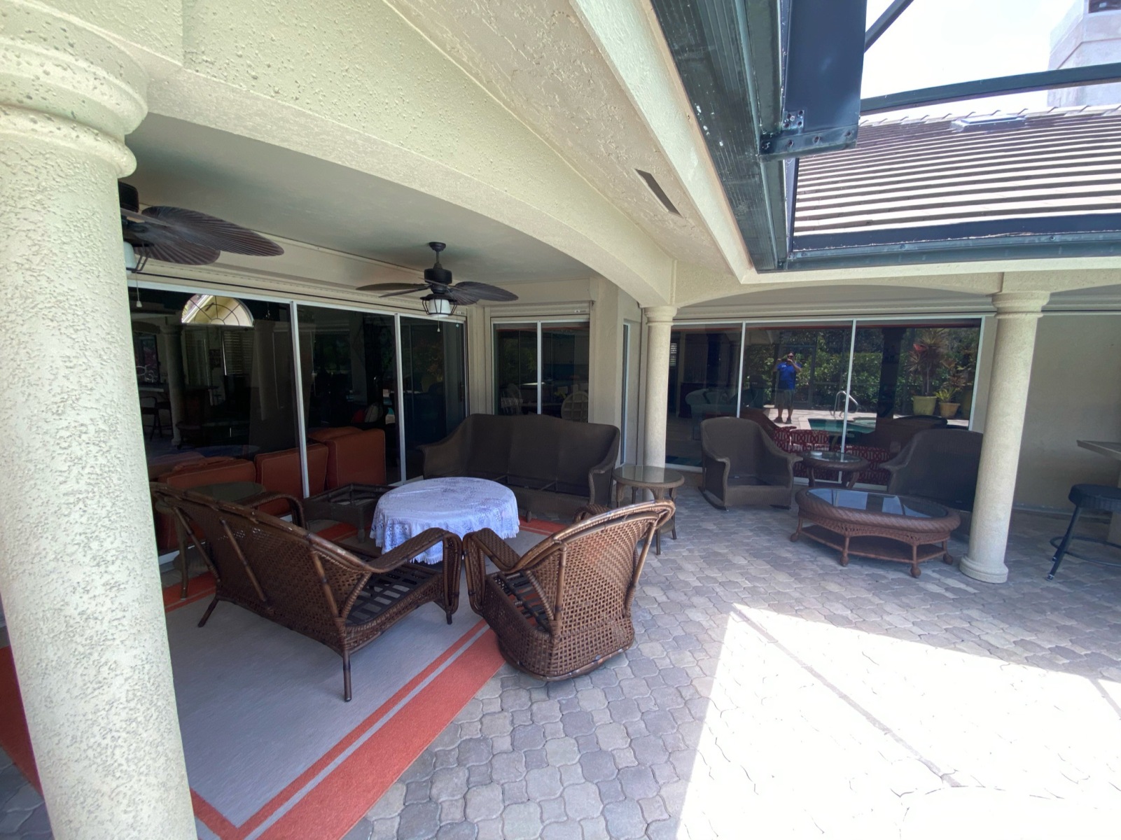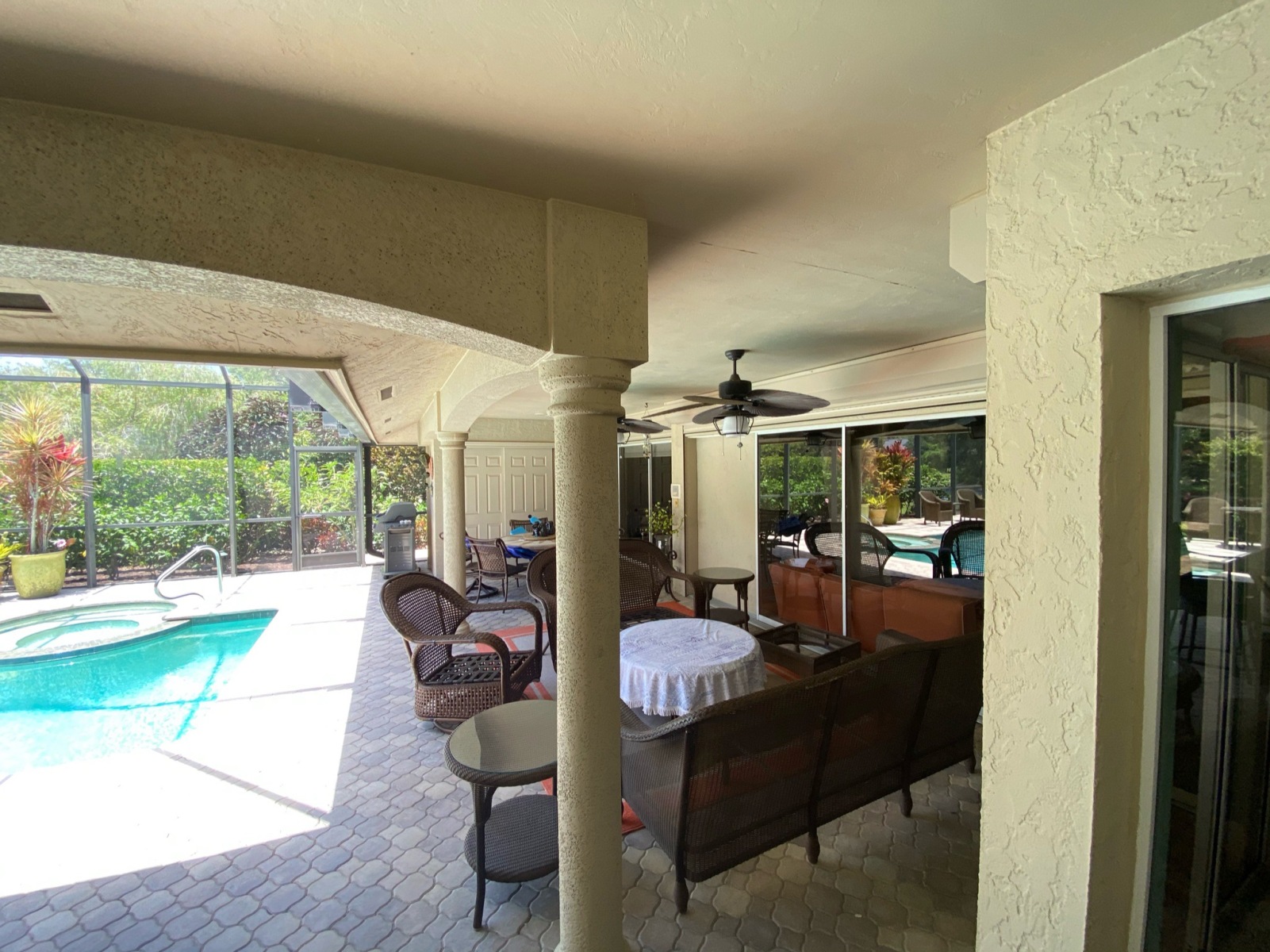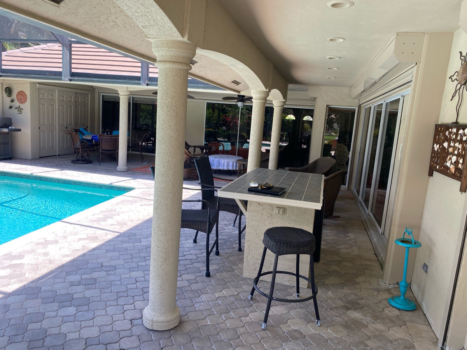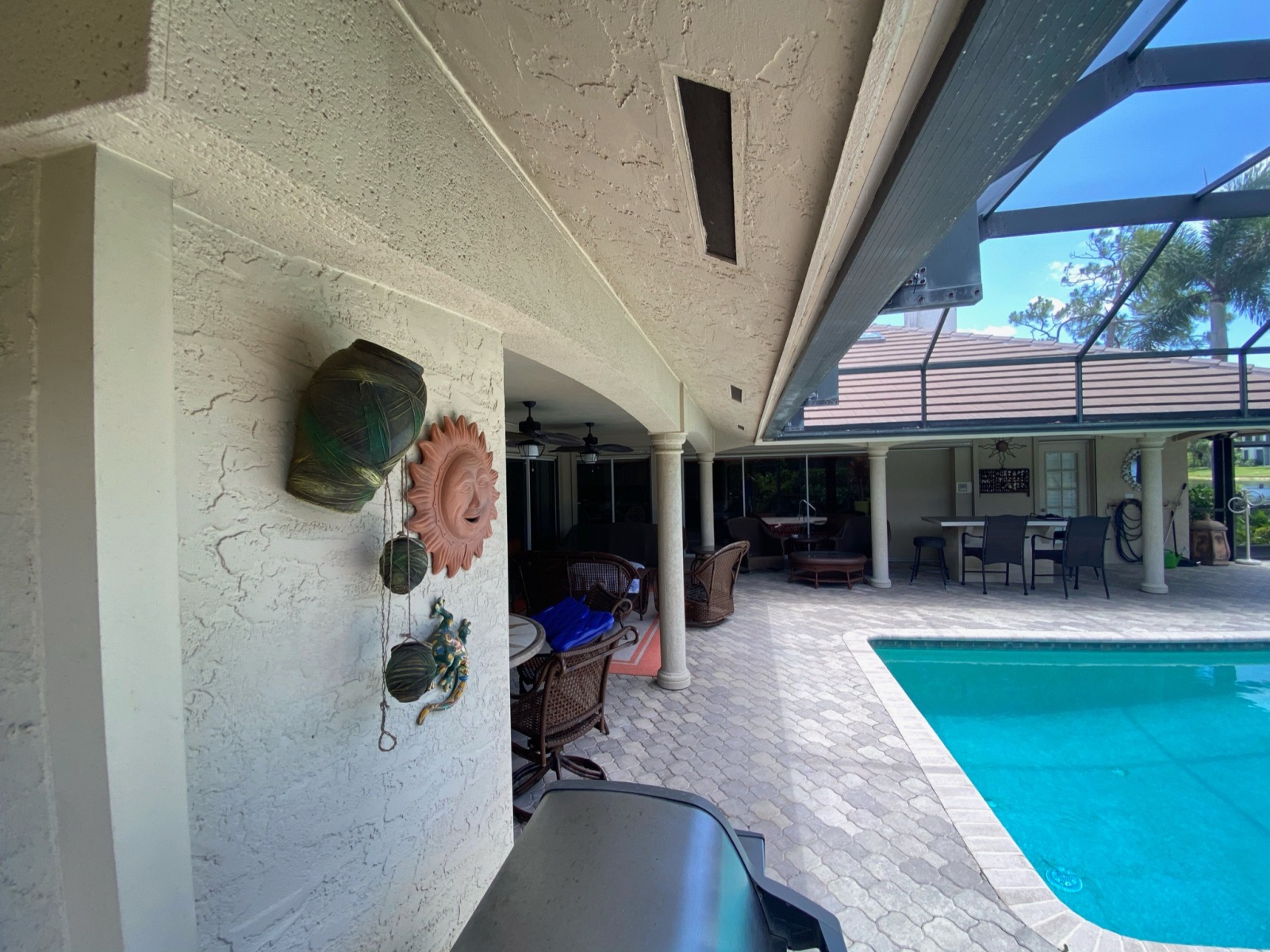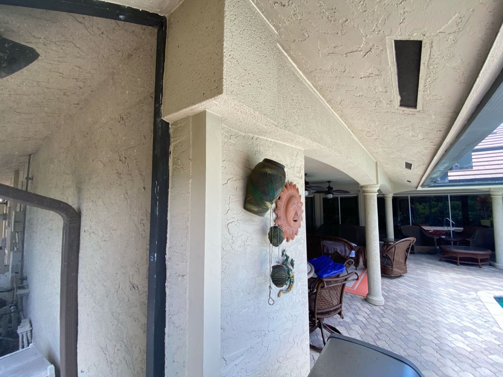 Additionally, steel columns and I-beams were used to replace the old lanai posts, increasing open space and improving the structure’s strength. This involved new concrete footers, drywall and stucco repairs, and full engineering for beam work.