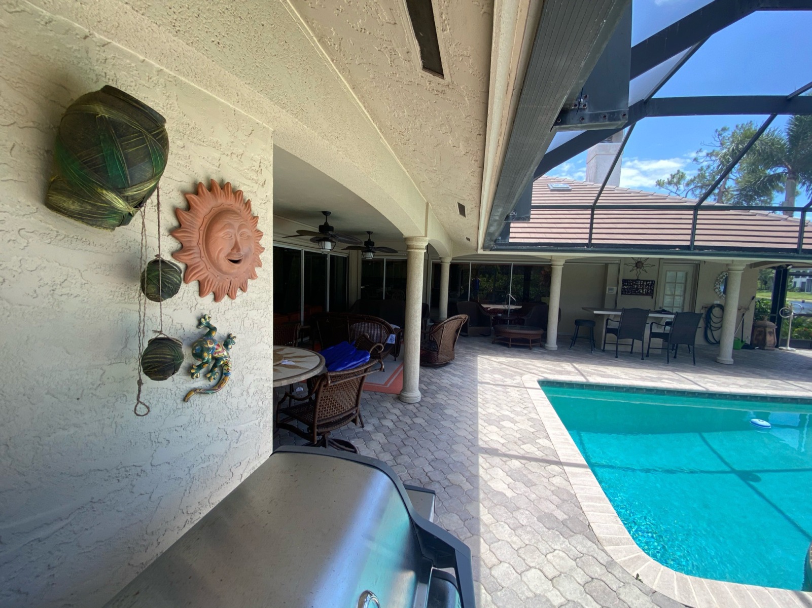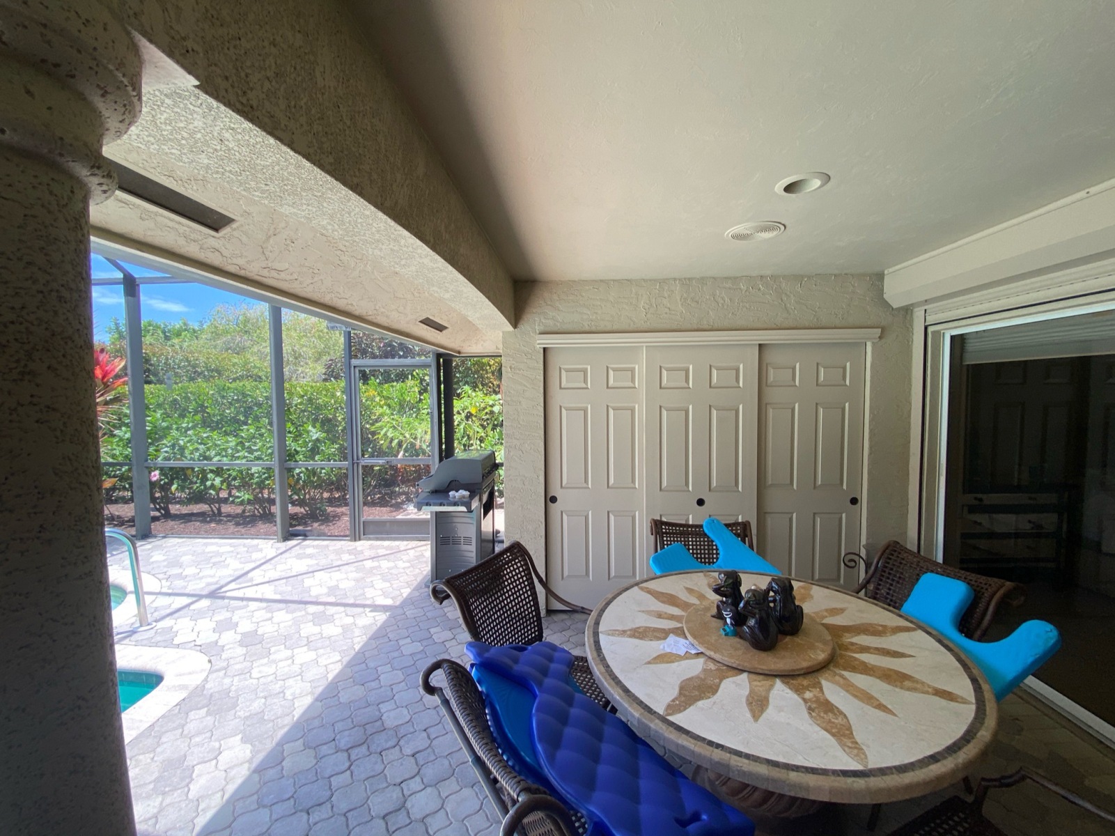 - Glass tile backsplash extending to the lanai ceiling
